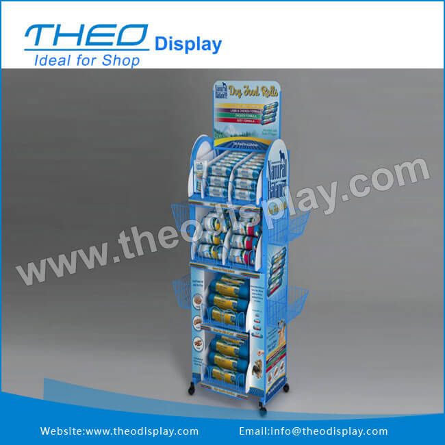 Mobile Full Size Retail Display Rack to Merchandise Rolled Dog Food Product
