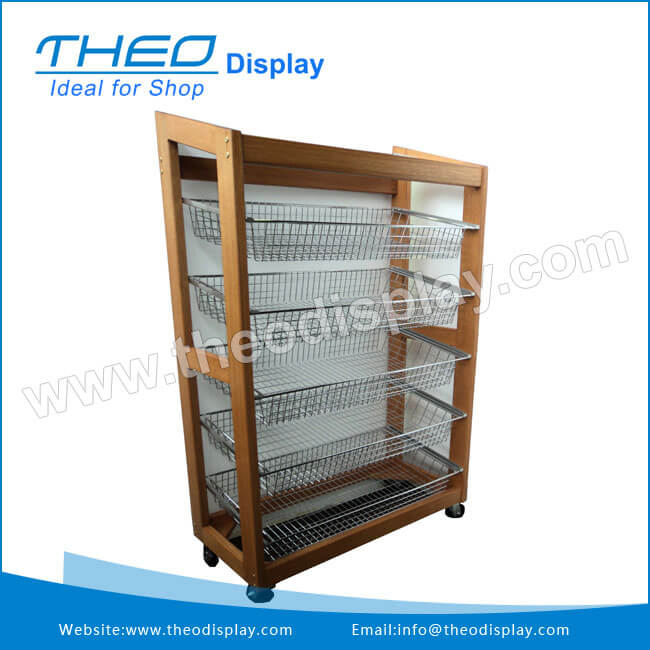 Wooden Frame Wire Basket Shelf Free Standing Retail Display Stand Rack